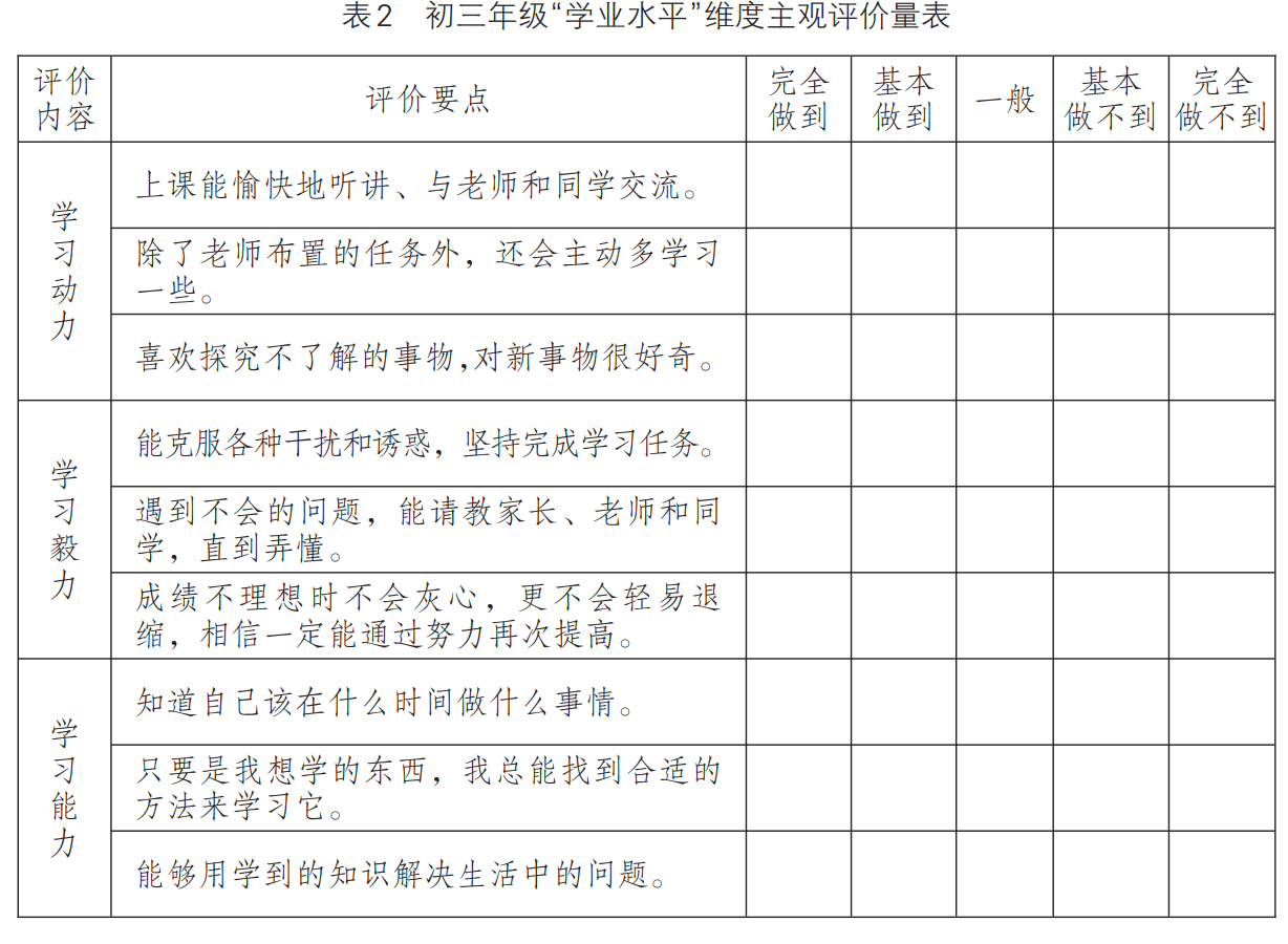 主觀評(píng)價(jià)主要考查學(xué)生的興趣、態(tài)度、習(xí)慣、方法、意志力與持久性等品質(zhì),且根據(jù)不同年級(jí)學(xué)生的特點(diǎn)有所側(cè)重。評(píng)價(jià)標(biāo)準(zhǔn)與學(xué)生正向評(píng)價(jià)量表中相關(guān)維度的指標(biāo)完全一致,每條評(píng)價(jià)標(biāo)準(zhǔn)設(shè)置“完全做到”“基本做到”“一般”“基本做不到”“完全做不到”五個(gè)層次,分別對(duì)應(yīng)5分—1分。例如初三年級(jí)“學(xué)業(yè)水平”維度主觀評(píng)價(jià)量表(見表2)。