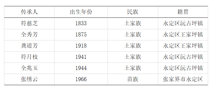 永定土家刺繡是一種普遍流傳于婦女之間的傳統手工技藝,歷史久遠,其源頭可以追溯到土家族服飾的起源。《后漢書·南蠻西南夷列傳》記載“織績木皮,染以草實,好五色衣服,制裁皆有尾形”;唐代詩人劉禹錫詩云“蠻衣斑斕布”;《宋史·蠻夷傳》記載“椎髻跣足,走險如履平地,言語侏離,衣服斑斕”,從這些記載土家族服飾的史料中可以窺見土家刺繡久遠的起源。2001年出土的土家族“八幅羅裙”將永定土家刺繡有據可考的歷史推進至明代中晚期。歷史上,永定土家刺繡為婦女之間互相傳播和母女之間代代相傳,據永定土家刺繡傳承譜系記載,清中期至今有6名傳承人(見表1)。