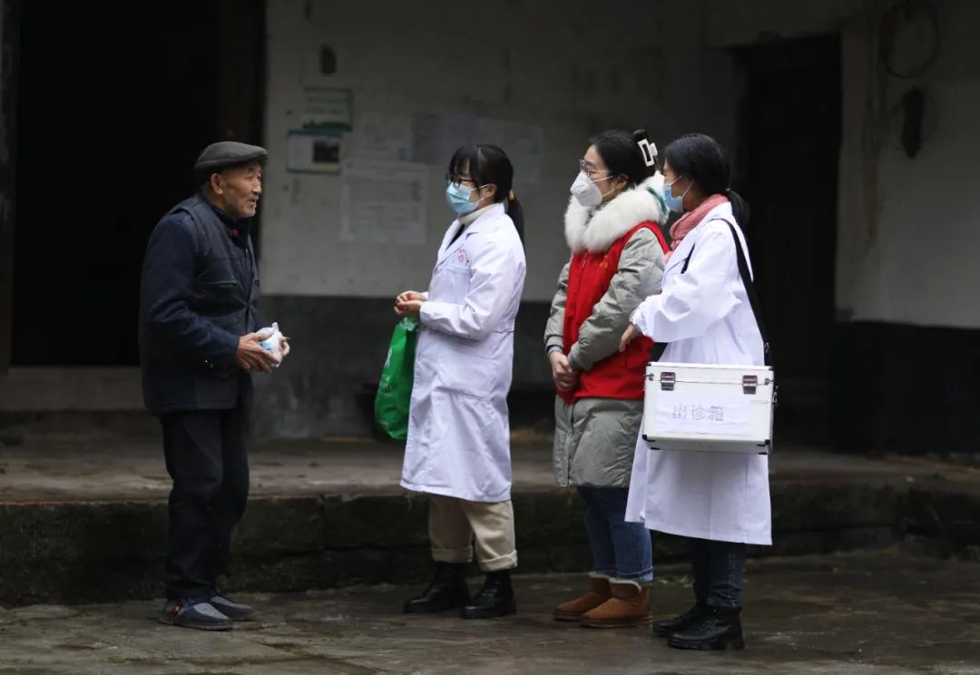 2022年12月28日,在貴州赤水市石堡鄉興農村,醫護人員和黨員志愿者為村民提供送藥上門服務。新華社發(王長育攝)