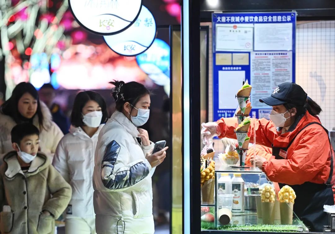 2022年12月30日,游客在陜西西安大唐不夜城步行街選購小吃。新華社發(鄒競一 攝)