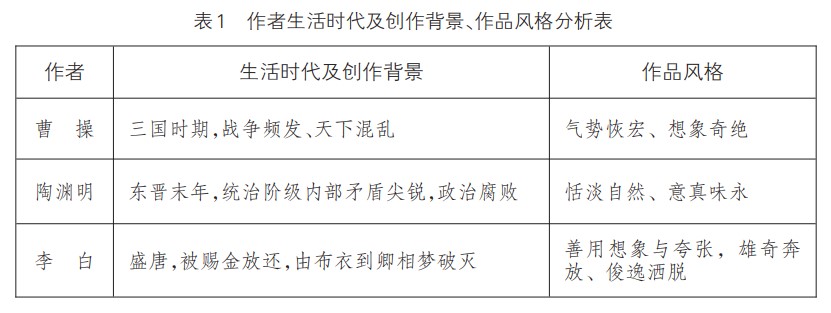 一是知人論世。作者的生活時代及創作背景決定了作品的創作風格,因此,引導學生先按照時代給作者分類(如表1),讓學生先了解時代特征,繼而掌握作者的創作風格,就不難把握作品的主題思想了。本單元的三課就是按照時代劃分的,學生利用工具書查找、了解作者,操作起來簡單,答案容易找到,對樹立學習自信心有很大的幫助。