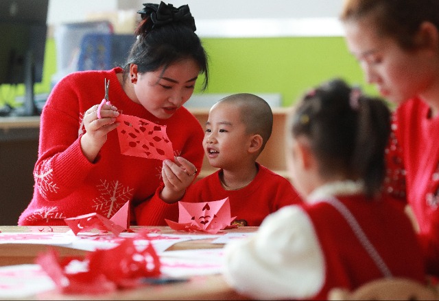 1月5日,甘肅省張掖市甘州區(qū)第九幼兒園師生一起剪窗花迎新年