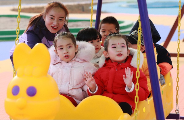 1月5日,甘肅省張掖市甘州區(qū)第九幼兒園小朋友在老師陪護下玩蕩船