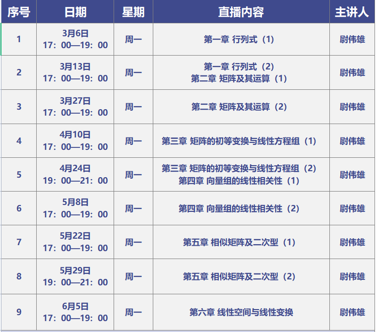 3月6日起,線性代數(shù)習(xí)題課將正式上線,設(shè)置9講直播課程,為大家排憂解難。