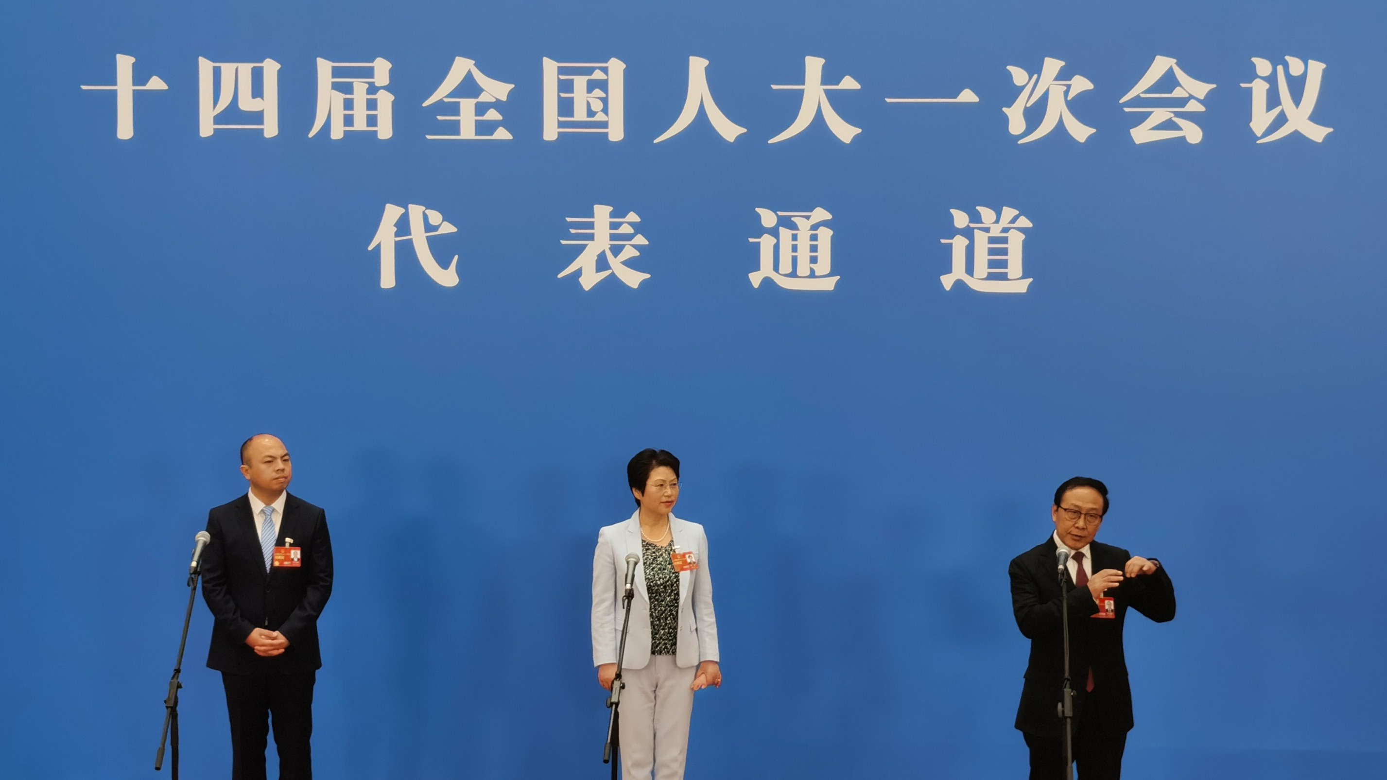 3月5日上午,十四屆全國人大一次會議舉行首場“代表通道”采訪活動。全國人大代表、云南大學教授、中國科學院院士張克勤(右1)接受采訪。(林煥新攝)