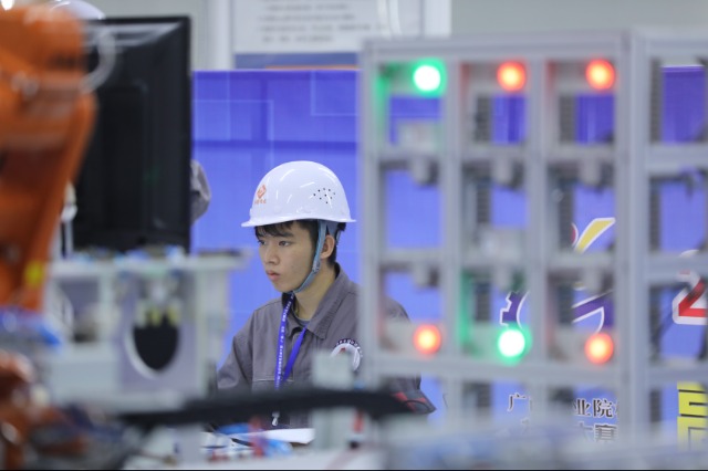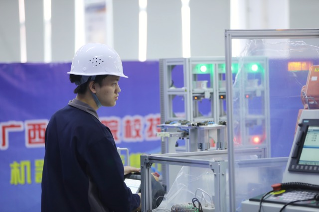 廣西職業(yè)院校技能大賽“機(jī)器人系統(tǒng)集成”比賽現(xiàn)場(chǎng)。莫青青 攝