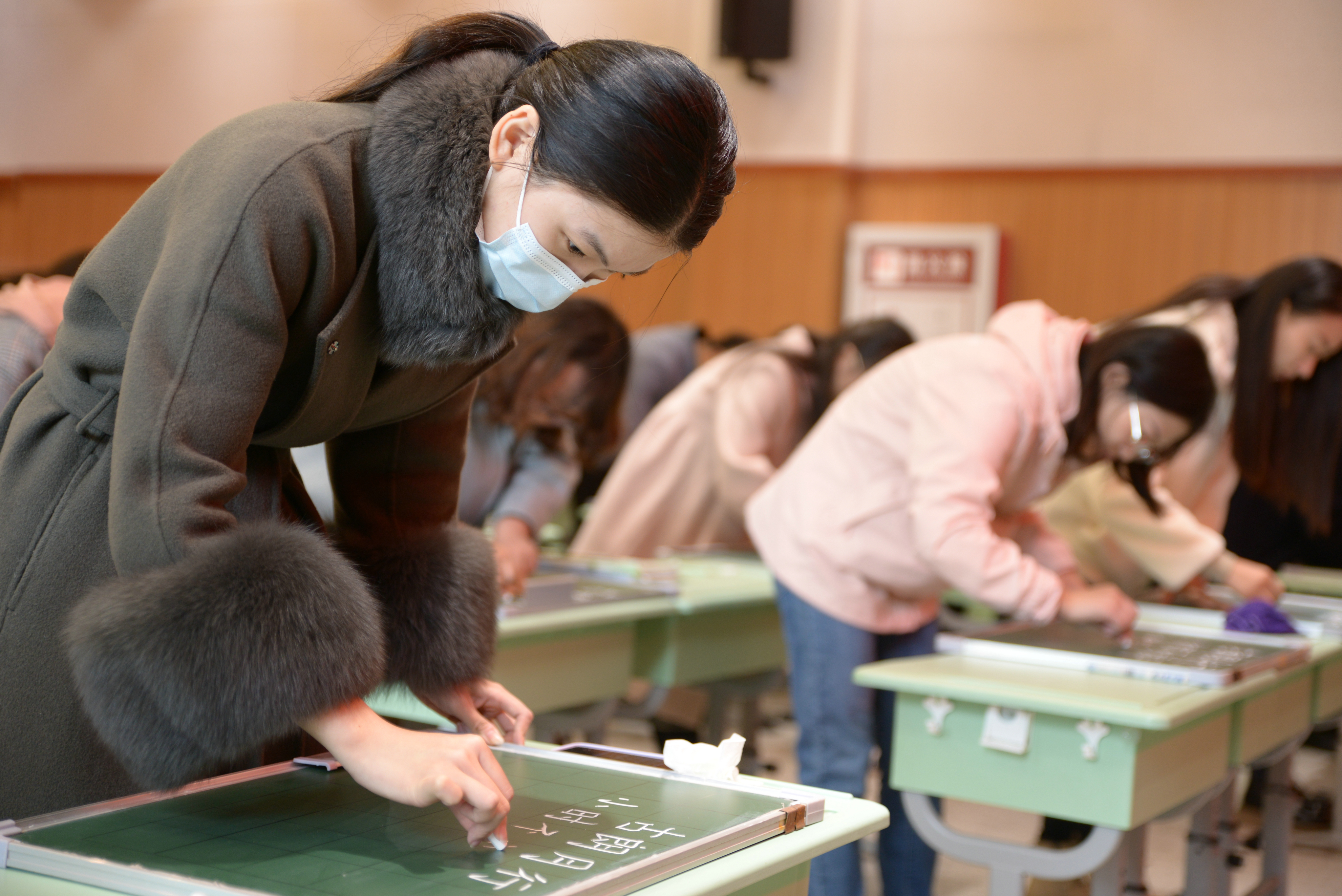 江蘇省東臺市第一小學教師粉筆字書寫基本功的展示與考核現場。許愛華攝