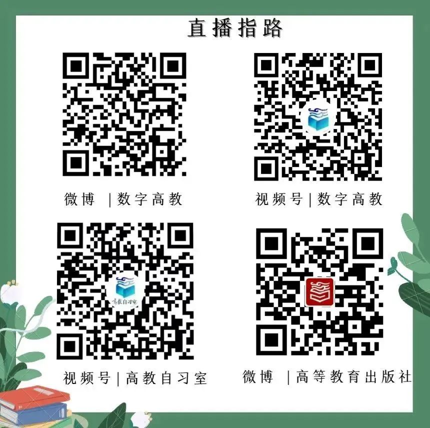 本次活動將通過數(shù)字高教視頻號、數(shù)字高教微博、高教自習(xí)室視頻號、高等教育出版社官方微博進行全網(wǎng)直播,掃碼即可觀看。