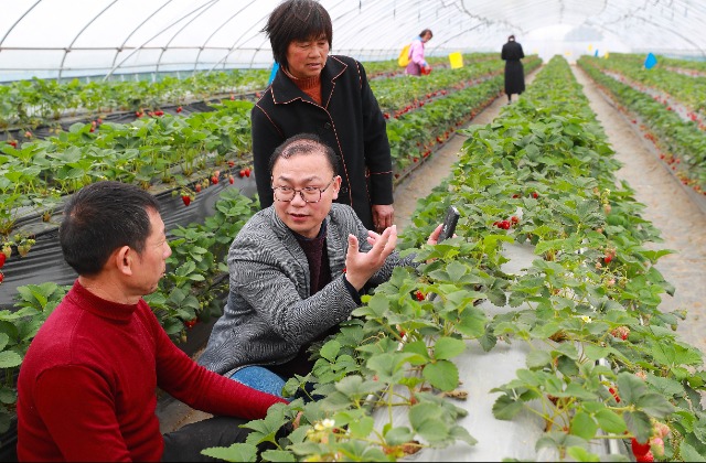 3月30日,江蘇省句容市白兔鎮笪小華家庭農場,江蘇農林職業技術學院草莓科技創新團隊王老師(左)指導農戶草莓花果管理。