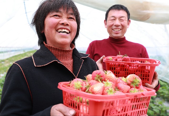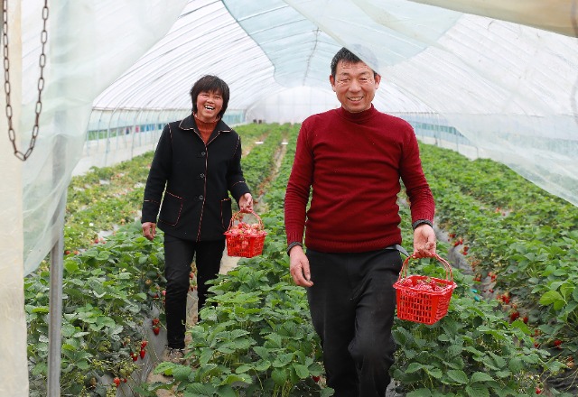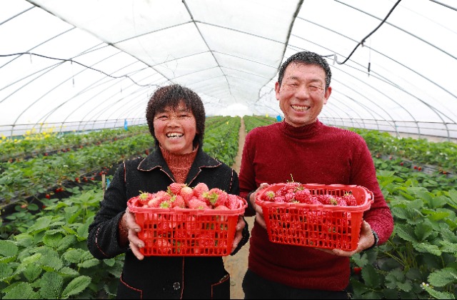 3月30日,江蘇省句容市白兔鎮笪小華(右)、包雅青夫婦提著剛剛采摘的草莓高高興興走出大棚。