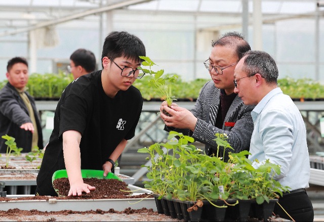3月30日,江蘇農林職業技術學院草莓科技創新團隊與群眾一起探討草莓種苗繁苗技術。