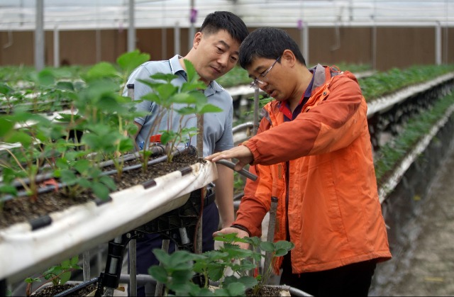 江蘇農林職業技術學院草莓科技創新團隊為種植戶測定基質理化性質。