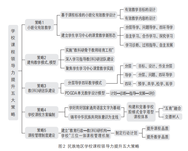 延邊州進行的以鑄牢中華民族共同體意識為主線提升中小學校(幼兒園)課程領導力的研究與實踐,提出了民族地區課程領導力提升五大策略(如圖2所示),構建了“培訓+研究+指導”的實踐模式。通過培訓、引領、指導校長和教師參與課程建設,進行課題(項目)研究,開發校本課程資源、實踐與改進教學設計等,提升校長和教師的課程理念建構力、課程設置執行力、課程內容管理力、課程實施組織力、課程資源開發力、課程評價實施力和校本教研引領力。