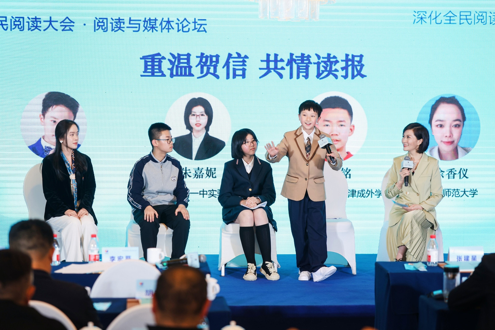 “重溫賀信·共情讀報——我是新時代青少年讀者”座談中,中國少年兒童文化藝術基金會會長闞麗君與小學生代表、嘉興市實驗小學科技城校區王梓軒,中學生代表、嘉興一中朱嘉妮,高中生代表、四川省成都市石室中學胡書銘,大學生代表、華東師范大學余香儀,共同重溫習近平總書記致首屆全民閱讀大會的重要賀信精神,講述自己從主流報紙及報業新媒體中獲取信息和知識的心得體會。