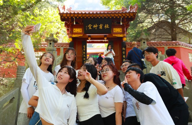 現(xiàn)場授課結(jié)束后,學(xué)生在杜甫草堂前合影留念。