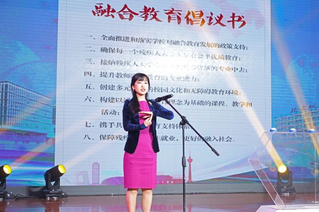北京聯(lián)合大學特殊教育學院教師曲欣宣讀融合教育倡議書 北京聯(lián)合大學特殊教育學院供圖