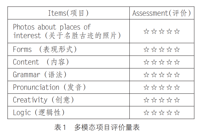 重過程、優評價,關注反饋改進。作業承載著評價屬性的功能,用于診斷確定學生知識與技能的習得掌握程度、反饋學生的能力水平、態度情感與教師教學的有效性等,促進師生雙方調節改進后續的教與學。在作業評價的實踐中,筆者所在的團隊變以往的以教師評價為主的方式為“學生自評”“生生互評”“師生評價”等相結合的多元評價方式。通過教師及時批改作業并進行評價,及時了解學生對語言知識、能力等的掌握情況;通過激勵性的語言及“漸進達標型”評價,讓學生感受到他人的關懷,提升學習的動力;通過建立評價量表等方式,重視學生學習及作業的過程性評價,重視學生的情感體驗,運用作業的反饋功能,改進教學,促進學生成長。例如,在多模態輸出項目作業中,通過設計評價量表,提供支架促成“生生評價”,讓學生更積極踴躍地參與作業評價,實現自我成長(見表1)。