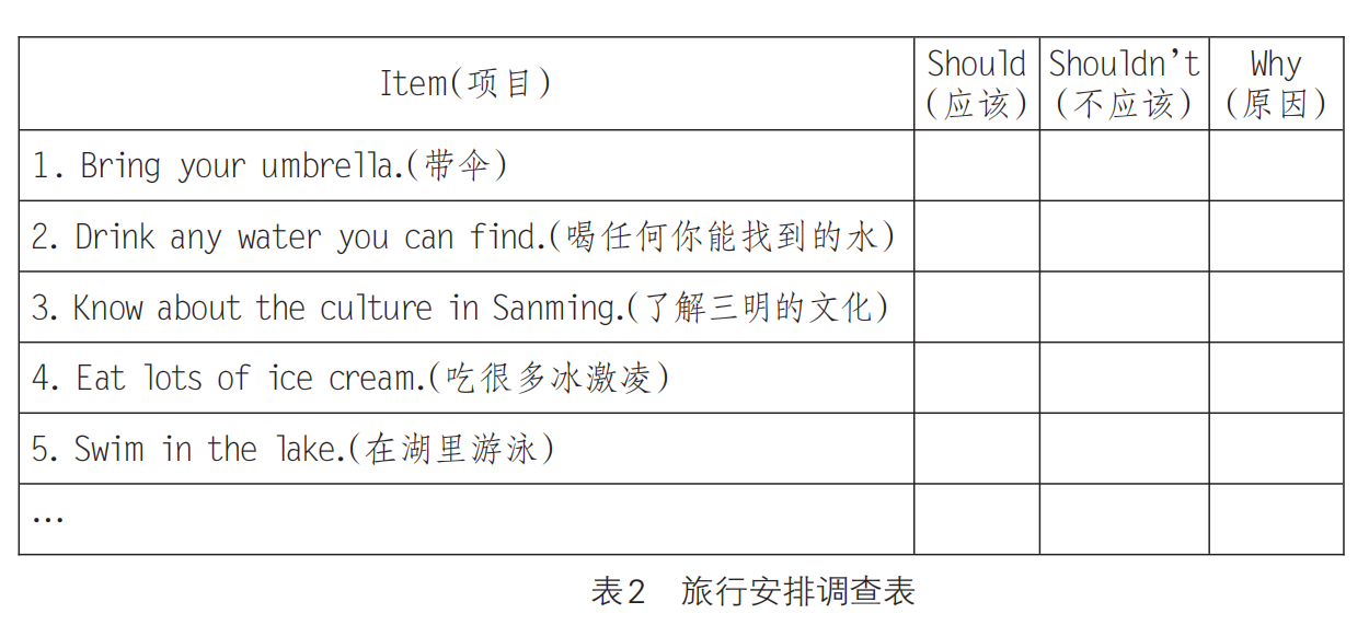 1. Suppose Kangkang is going on a trip to Sanming in July with his friends. Discuss it with your partner and check (√) what they should or shouldn’t do and give the reason.(假設康康7月要和他的朋友去三明旅行。與你的同伴討論,檢查他們應該做什么或不應該做什么,并給出原因。)(見表2)