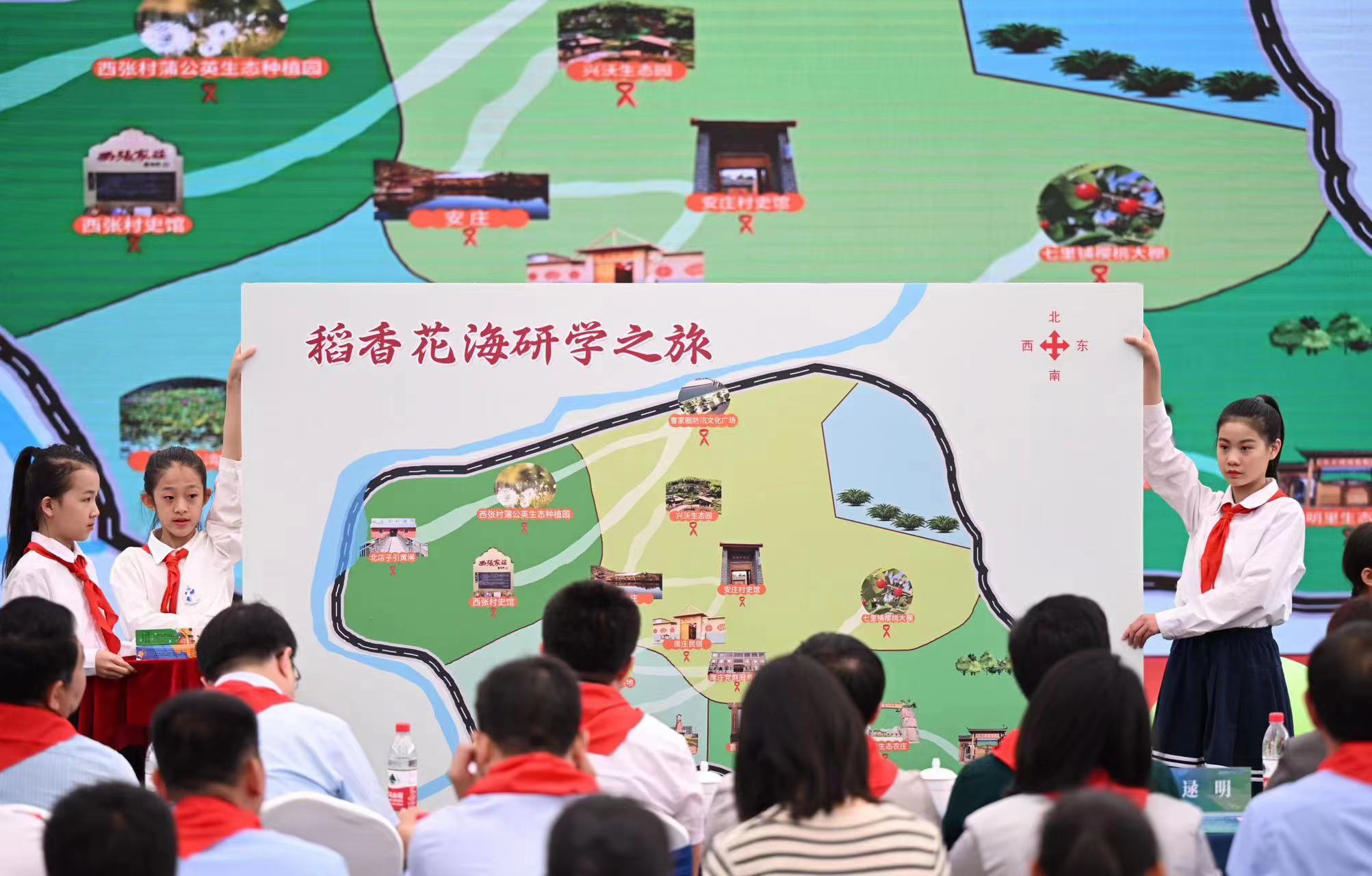 紅領(lǐng)巾講解員為大家推介黃河研學(xué)課程。濟(jì)南槐蔭區(qū)教體局供圖