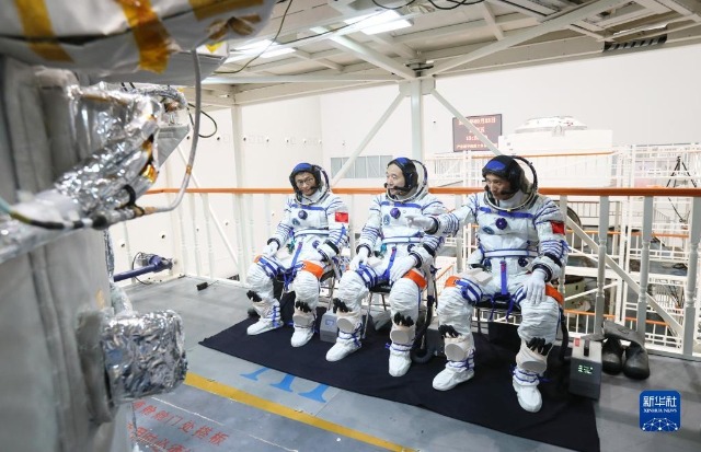 神舟十六號航天員乘組在人船合練中交流(2022年9月23日攝)。新華社發(徐部 攝)