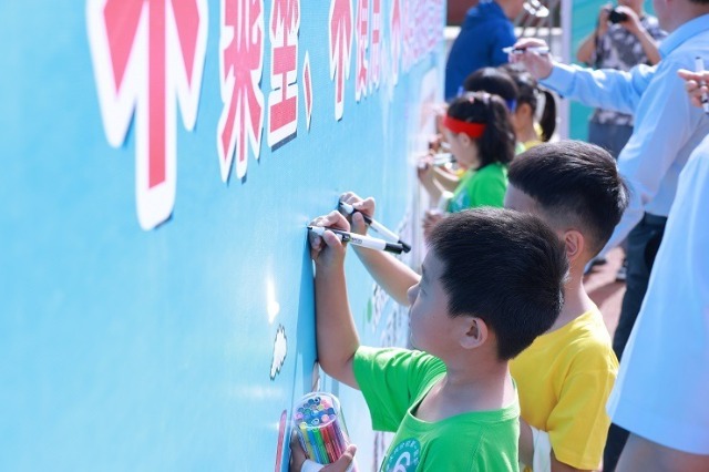孩子們在交通安全承諾墻上簽名。學(xué)校供圖