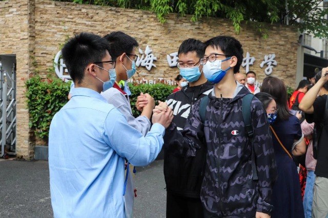 上海田家炳中學(xué)考點(diǎn),四位考生在互相鼓勁。何思哲 攝