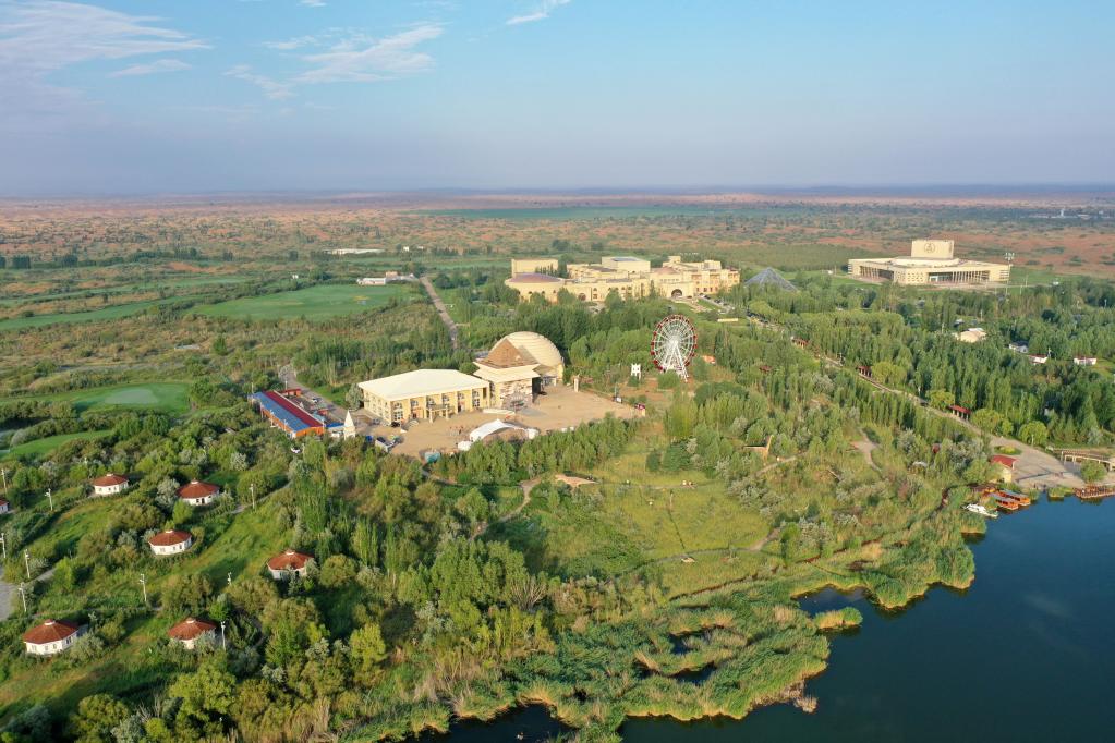 這是內蒙古鄂爾多斯市庫布其沙漠腹地的七星湖景區(2021年7月17日攝,無人機照片)。新華社記者 金良快 攝
