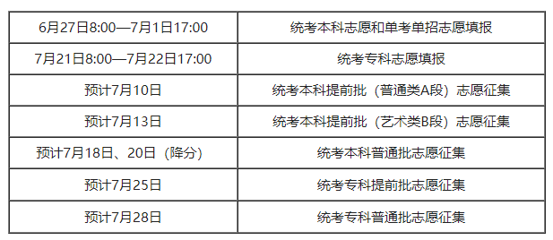 7. 7月1日17時至7月4日17時考生通過系統可查看本人的統考本科或者單考單招志愿填報信息。