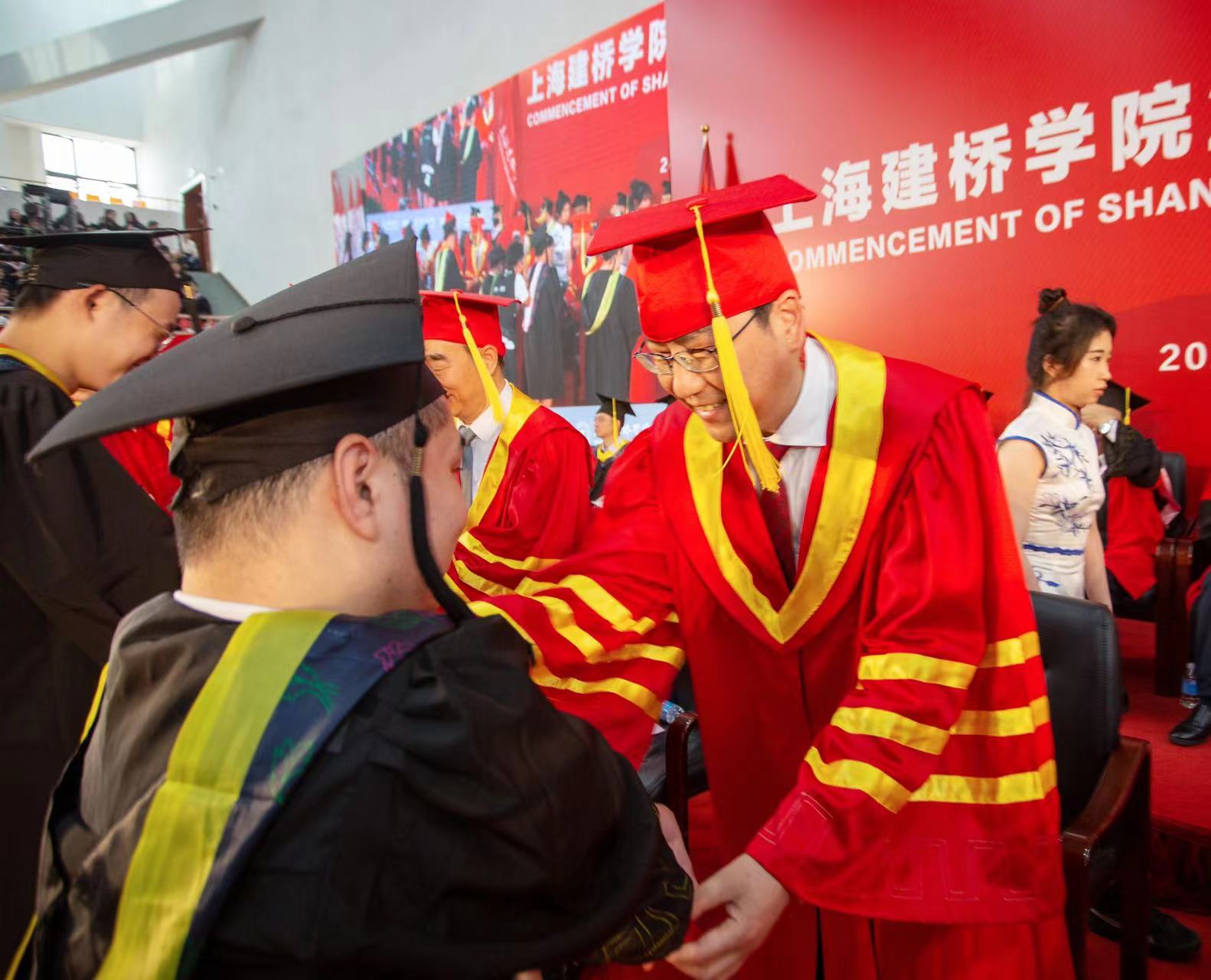 上海建橋?qū)W院校長朱瑞庭教授為陳光耀頒發(fā)畢業(yè)證書。學校供圖