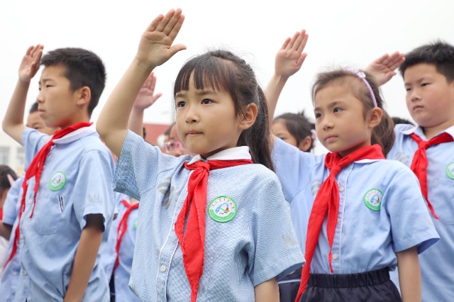 5月29日,安徽省六安市金安區(qū)豐安小學(xué)舉行少先隊員入隊儀式,少先隊員們向隊旗敬禮。通訊員 田凱平 攝