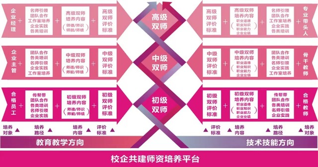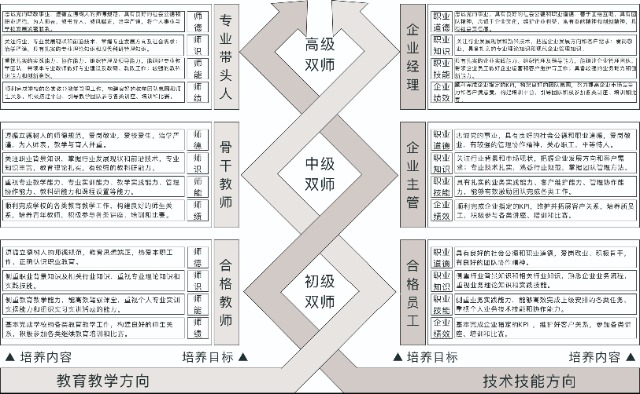 構(gòu)建適應(yīng)崗位任職與專(zhuān)業(yè)發(fā)展需求的課程體系。學(xué)校需要根據(jù)個(gè)人成長(zhǎng)規(guī)律及職業(yè)教育規(guī)律,結(jié)合實(shí)際教學(xué)情況,提出不同的培養(yǎng)內(nèi)容和培養(yǎng)途徑。同時(shí),每個(gè)階段圍繞教育教學(xué)方向、技術(shù)技能方向(雙向)進(jìn)行針對(duì)性培養(yǎng),制定統(tǒng)一的“雙師型”評(píng)價(jià)標(biāo)準(zhǔn),對(duì)企業(yè)兼職教師側(cè)重師德、師識(shí)、師能、師績(jī)等方面考評(píng),對(duì)專(zhuān)業(yè)教師側(cè)重職業(yè)道德、職業(yè)知識(shí)、職業(yè)技能、企業(yè)績(jī)效等方面的考評(píng),最后專(zhuān)業(yè)教師和企業(yè)技師都融向同一培養(yǎng)目標(biāo)——“雙師型”教師,包括初、中、高三個(gè)層級(jí),詳見(jiàn)圖2。