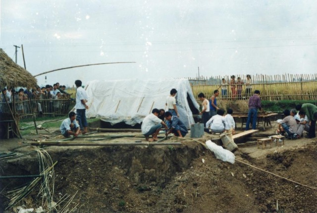 1986年,考古人員在三星堆考古發(fā)掘現(xiàn)場工作。新華社發(fā)(三星堆博物館供圖)