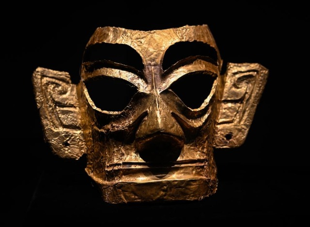這是日前在三星堆博物館新館拍攝的新展出的金面具。新華社記者 王曦 攝