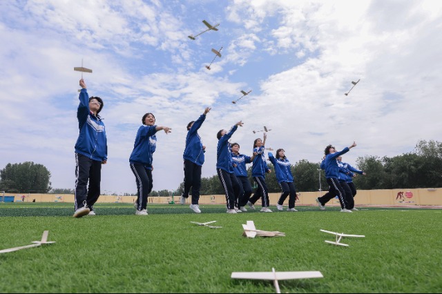 5月29日,河北省邢臺市內丘縣第二中學學生在投擲模型飛機。通訊員 劉繼東 攝