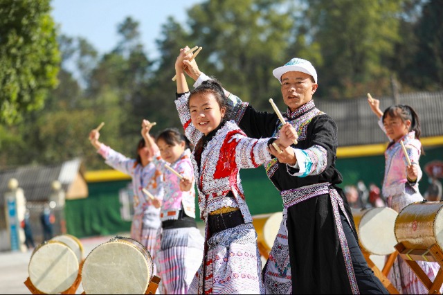 2022年11月2日,貴州省黔西市新仁苗族鄉新仁小學學生在老師的帶領下練習打鼓蘆笙舞的基本動作。通訊員 周訓超 攝