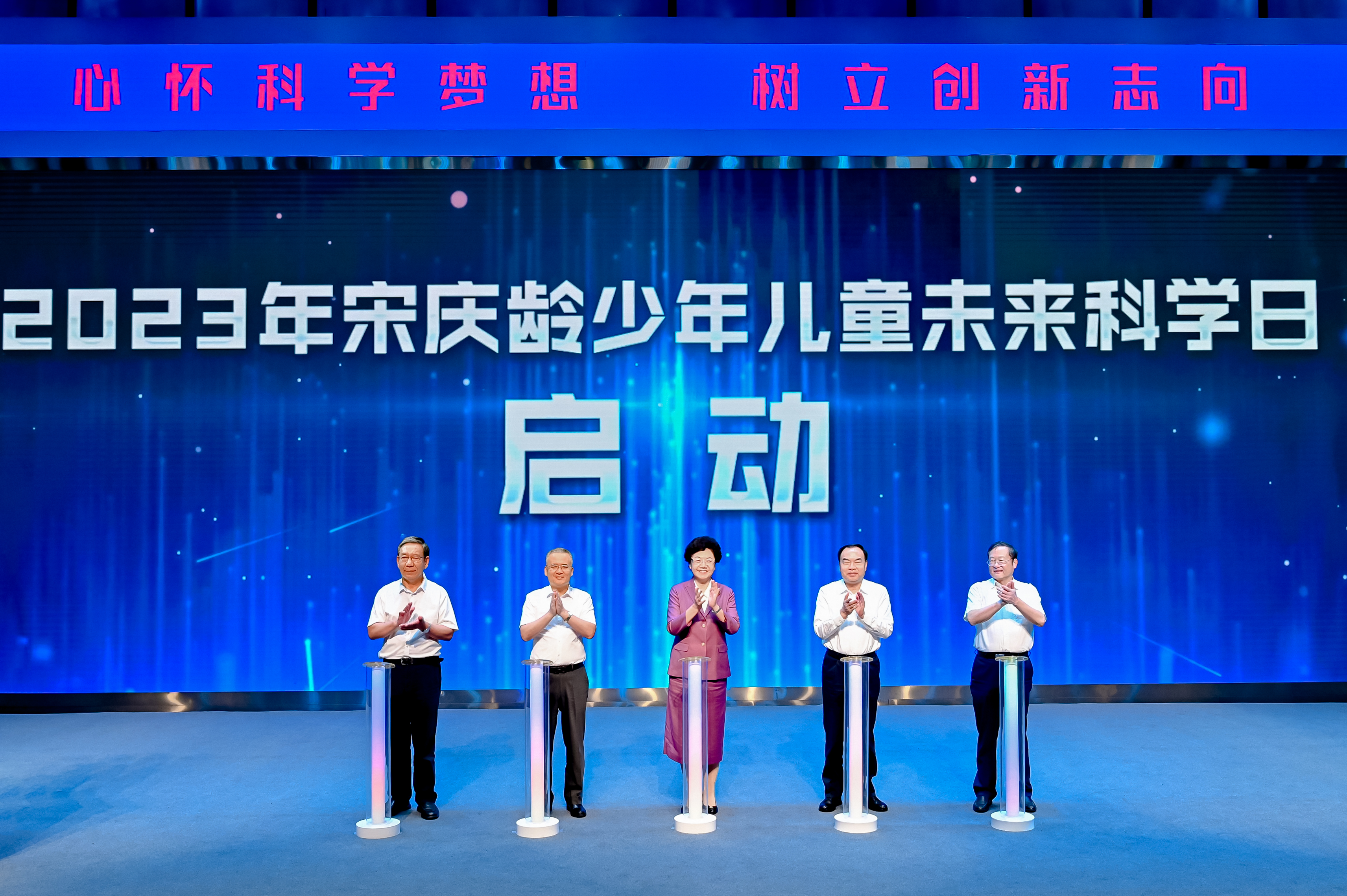 活動現場,李斌、唐良智、孟慶海與中國科學院院士、中國科學技術大學教授、安徽省政協副主席鄭永飛,中國工程院院士、深空探測實驗室主任兼首席科學家吳偉仁共同啟動2023年宋慶齡少年兒童未來科學日。
