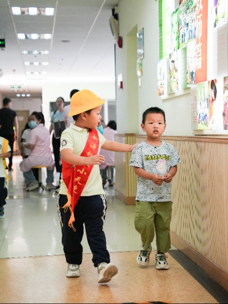 在嘉定區(qū)新源幼兒園,大班的哥哥姐姐組成“源寶護(hù)衛(wèi)隊(duì)”,用暖心的話語和柔軟的小手護(hù)送小班的弟弟妹妹到班級(jí),大手拉小手,成長愛相伴。