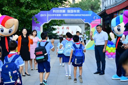 中國教育報-中國教育新聞網訊(通訊員 李典)9月1日,北京市海淀區民族小學新學期開學典禮暨科技節啟動儀式舉行。典禮以“科技創新,強國有我”為主題。現場儀式感滿滿、科技氛圍感十足。操場兩側,舞臺前方的紅毯上,家長和老師共同撐起“愛心傘”,迎接一年級的新生入場。“愛心傘”由美術老師帶領高年級的哥哥姐姐們親手繪制,飽含民小全體師生對新生們滿滿的愛意和祝福。