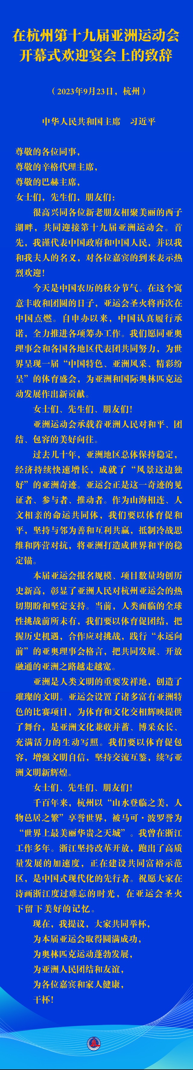 很高興同各位新老朋友相聚美麗的西子湖畔,共同迎接第十九屆亞洲運動會。首先,我謹代表中國政府和中國人民,并以我和我夫人的名義,對各位嘉賓的到來表示熱烈歡迎!