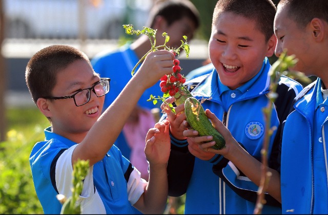 9月27日,在金塔縣第四中學(xué)的開心農(nóng)場(chǎng),七年級(jí)學(xué)生比拼自己的采摘成果。