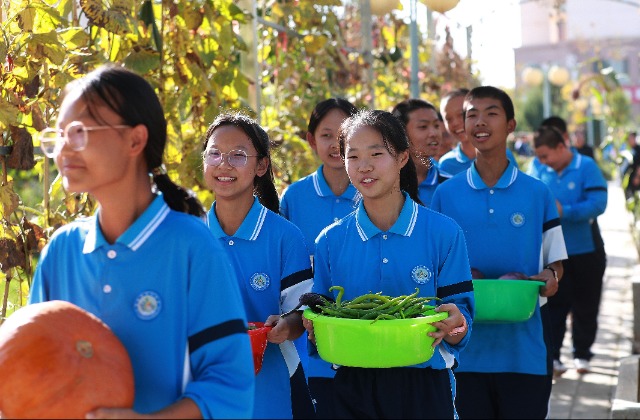 9月27日,金塔四中學(xué)生們將采摘的蔬菜送往食堂。