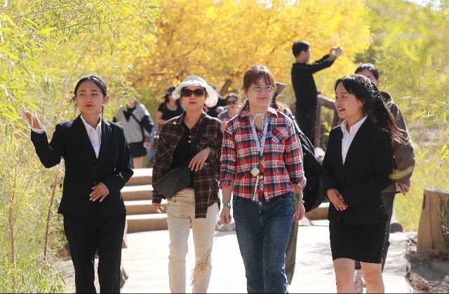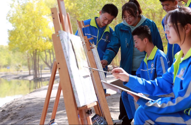 每年這時候,金塔汽車維修中等專業學校的師生都會如期而至,既是研學活動,也是該?!肮そ彻潯被顒拥难永m。學生或在湖邊寫生,或展示舞蹈,或給游客講解,或當志愿者引導游客、撿拾垃圾,還在景區講解員的帶領下走進胡楊林研究中心,深入了解這里的人文歷史,近距離感受胡楊精神。