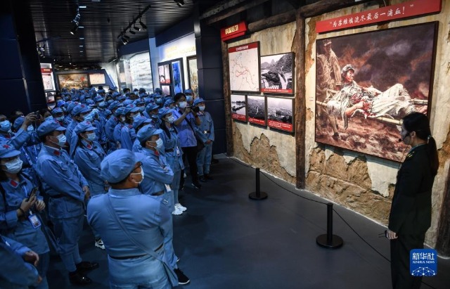 在紅軍長征湘江戰役紀念館的油畫《陳樹湘》前,黨員們聆聽講解員講述陳樹湘為蘇維埃流盡最后一滴血的故事(2021年5月18日攝)。新華社記者 張愛林 攝