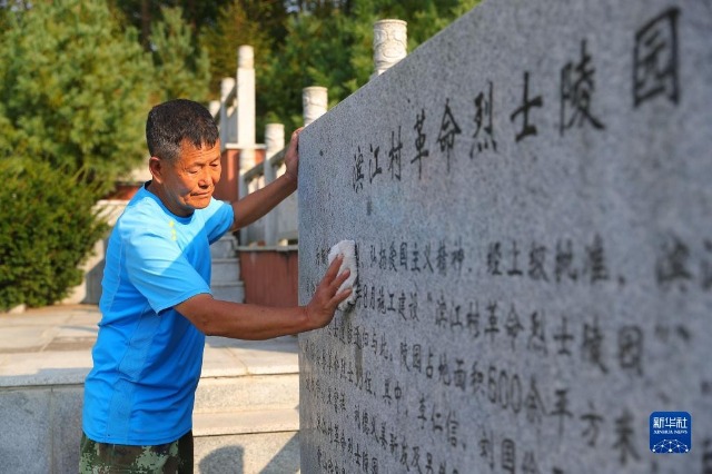 在遼寧省丹東市振興區濱江村,村民擦拭濱江村革命烈士陵園石碑(2022年9月26日攝)。新華社記者 楊青 攝