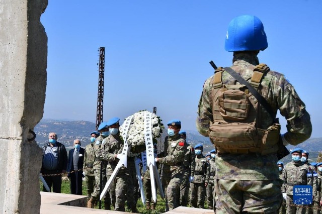 中國維和官兵在黎巴嫩南部希亞姆鎮向烈士紀念碑敬獻花圈(2021年4月4日攝)。新華社發(丁文棟 攝)
