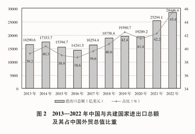 貿易投資規模穩步擴大。2013-2022年,中國與共建國家進出口總額累計19.1萬億美元,年均增長6.4%;與共建國家雙向投資累計超過3800億美元,其中中國對外直接投資超過2400億美元;中國在共建國家承包工程新簽合同額、完成營業額累計分別達到2萬億美元、1.3萬億美元。2022年,中國與共建國家進出口總額近2.9萬億美元,占同期中國外貿總值的45.4%,較2013年提高了6.2個百分點;中國民營企業對共建國家進出口總額超過1.5萬億美元,占同期中國與共建國家進出口總額的53.7%。