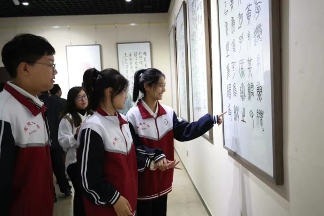 學生在欣賞書法藝術展。寶坻區第一中學供圖