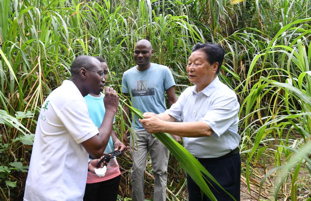 福建農林大學國家菌草工程技術研究中心首席科學家林占熺(右一)在福建農林大學菌草園讓尼日利亞留學生試嘗幼嫩菌草的味道(2021年8月12日攝)。新華社記者 林善傳 攝