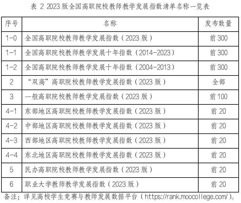 本次發布的全國高職院校教師教學發展指數的一級指標包括“教師團隊”“產教融合”“專業與課程”“教材與論文”“教學成效”“教學組織”六個維度和“教學競賽”特別維度,調整2個二級指標、7個三級指標,與本科“教學成效”指標調整方式相一致,此外新增6個三級指標,新增數據量6萬7千余條,總數據量達42萬余條。