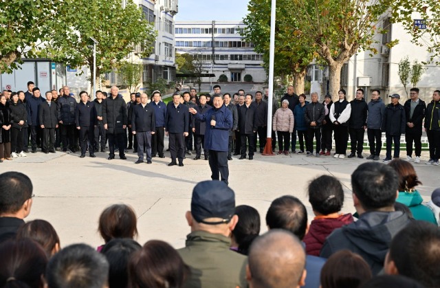11月10日,中共中央總書記、國家主席、中央軍委主席習近平在北京、河北考察災后恢復重建工作。這是10日下午,習近平在河北保定涿州市雙塔街道永濟秀園小區(qū)考察時,同小區(qū)居民們親切交流。新華社記者 殷博古 攝
